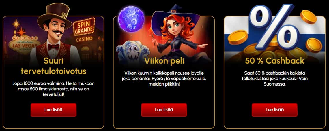 SpinGrande offre un “Grand Welcome Bonus” valido sui primi depositi. Le promozioni attive possono variare, ma in genere includono fino a 1.000 € + 500 giri gratis oppure un bonus del 100% + giri gratis sul primo deposito. Per ottenerlo, basta creare un account, effettuare un primo deposito minimo di 20 € e inserire, se richiesto, il codice promozionale GRANDE1 nella sezione Cassa. La struttura del bonus può cambiare in base alla regione o al periodo promozionale, quindi è sempre consigliato verificare l’importo aggiornato, i giochi idonei e le istruzioni nella pagina Promozioni prima di depositare.