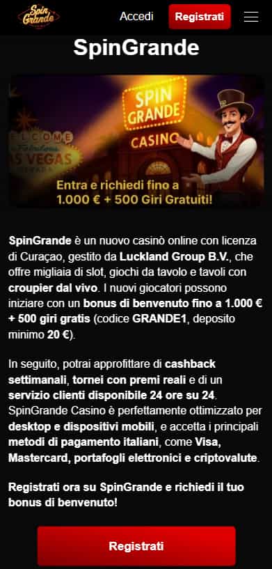 SpinGrande è un nuovo casinò online con licenza di Curaçao, gestito da Luckland Group B.V., che offre migliaia di slot, giochi da tavolo e tavoli con croupier dal vivo. I nuovi giocatori possono iniziare con un bonus di benvenuto fino a 1.000 € + 500 giri gratis (codice GRANDE1, deposito minimo 20 €).